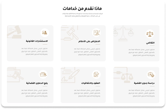 نلتزم بطابع رسمي مناسب للقطاع القانوني بعيداً عن المبالغات، مع إمـكــانيــــــــة تضمـــيـــــــن شعــــــــار المـكـتــــــــب وألــوان الـهـويـــــــــــــة البصــــــرية.